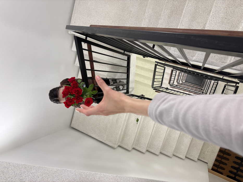 A high-angle shot depicts an interior stairwell within a building in Copenhagen, Denmark. In the foreground, a human arm, clad in a light grey long-sleeved garment, extends downwards from the bottom-left, with the open hand positioned as if reaching or gesturing. Below, on a lower landing, a person, appearing female with dark hair pulled back, looks upwards, her face largely concealed by a bouquet of approximately ten vibrant red roses she holds. This individual wears a dark, long-sleeved top and dark trousers paired with light-soled sneakers. The stairwell features speckled grey-white concrete steps, plain white walls, and black metal railings with dark wooden top rails. A single green leaf rests on one of the steps near the foreground arm. A section of a brown, patterned floor mat is visible at the bottom-left. The stairwell continues its descent, revealing multiple flights and landings below.