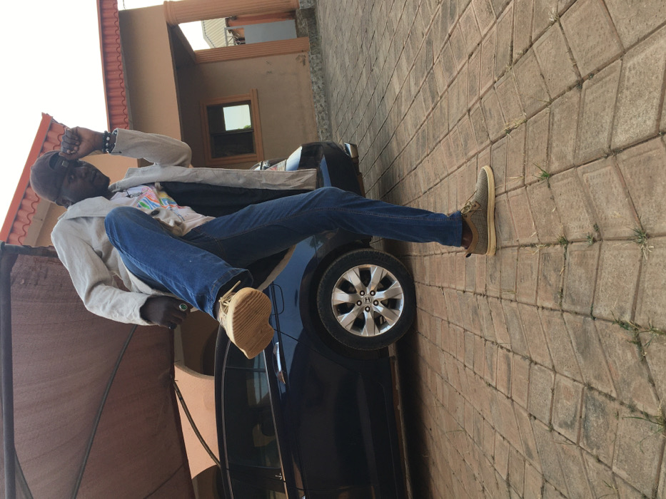 A man in a white jacket and blue jeans is posed on a dark sedan. One foot in a tan shoe rests on the car's hood, while the other foot in a similar shoe extends out over the brick pavement. The car has a silver wheel with a prominent Honda logo. The background features a building and a brown cloth structure. The sky appears overcast. The image is rotated ninety degrees counter-clockwise.