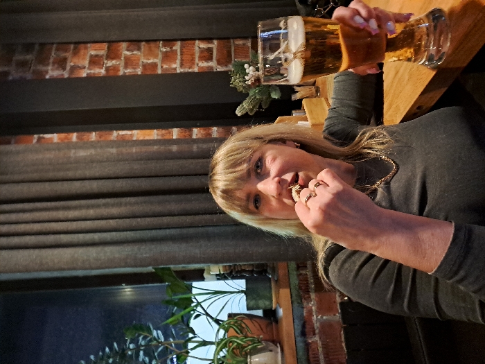 A woman with blond hair, bangs, and fair skin holds a beer glass in her right hand
