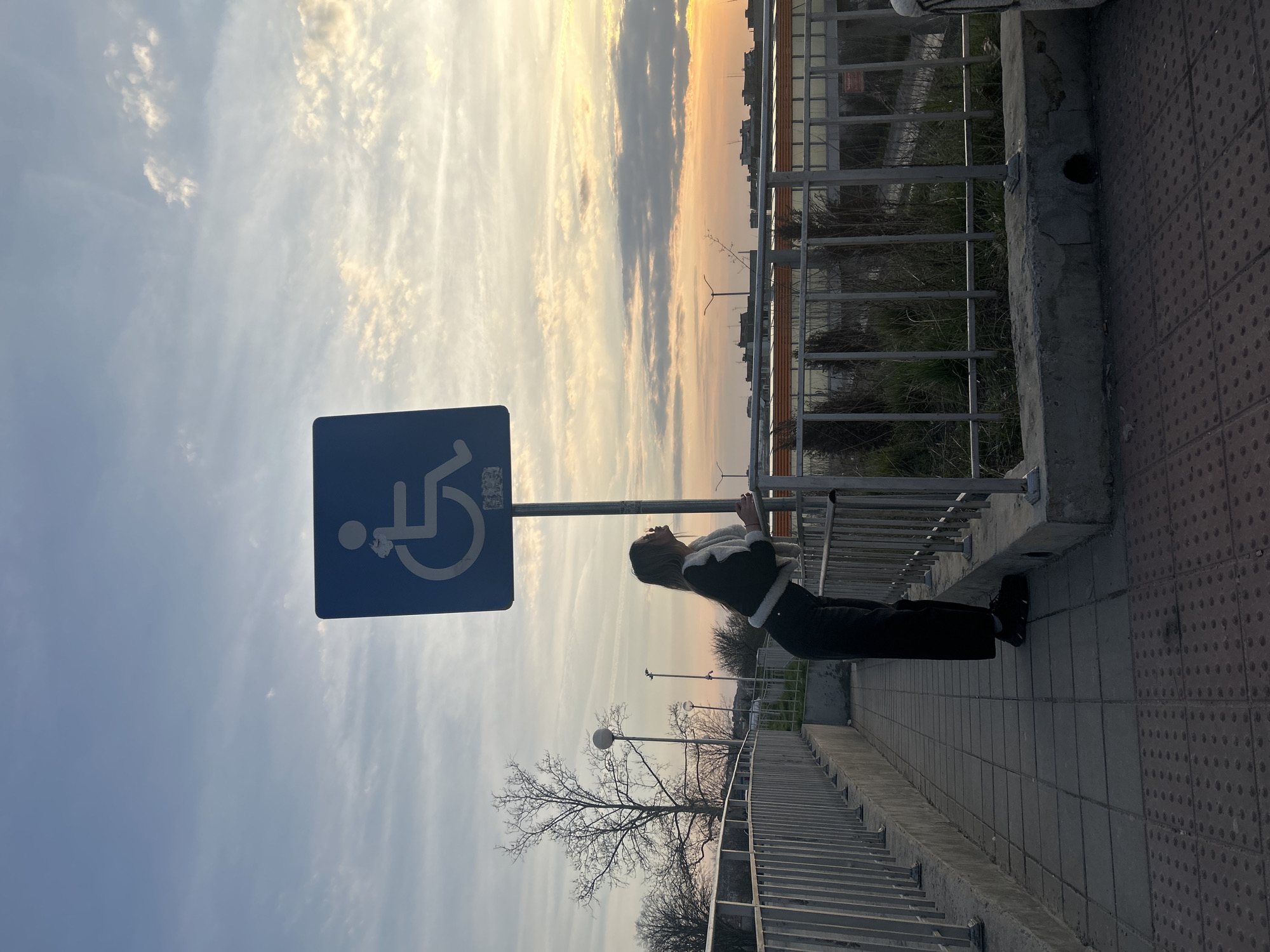 The scene depicts an outdoor urban environment in Ruse, Bulgaria, under a partially cloudy sky exhibiting warm orange and yellow tones near the horizon, indicative of either sunrise or sunset. A lone individual, identified as female, stands in profile on a concrete-tiled walkway, facing left. She is leaning forward, resting her forearms on a silver-colored metal railing, and appears to be observing the sky or distant horizon. She wears a dark jacket with a light-colored collar and trim, dark trousers, and dark sneakers. Adjacent to her on the right, a blue square sign featuring the white international symbol of access (wheelchair user) is mounted on a vertical metal pole; the sign shows minor wear. The walkway is paved with square and rectangular tiles, incorporating tactile paving sections. In the background, beyond the railing, bare deciduous trees, multiple streetlights, and the silhouettes of buildings including a structure with an orange upper band are visible. Vegetation, primarily overgrown grasses, is present below the background railing.