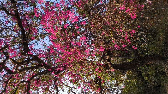 The image depicts a vibrant flowering tree located in Samudram, India. The central subject is a mature tree with a thick, gnarled dark brown trunk and a dense canopy of interwoven branches. The tree is heavily laden with numerous clusters of bright pink, papery flowers, interspersed with some green foliage. The flowers are concentrated on the upper and mid-sections of the branches, creating a striking contrast with the dark bark. A clear, light blue sky is visible through the gaps in the branches at the top of the frame. The lower and background areas consist of a natural environment with dense green and dark brown undergrowth, indicating a vegetated area. No individuals, animals, or man-made objects are visible within the frame, and no specific actions or interactions are depicted. The scene is illuminated by natural light, suggesting daytime conditions.