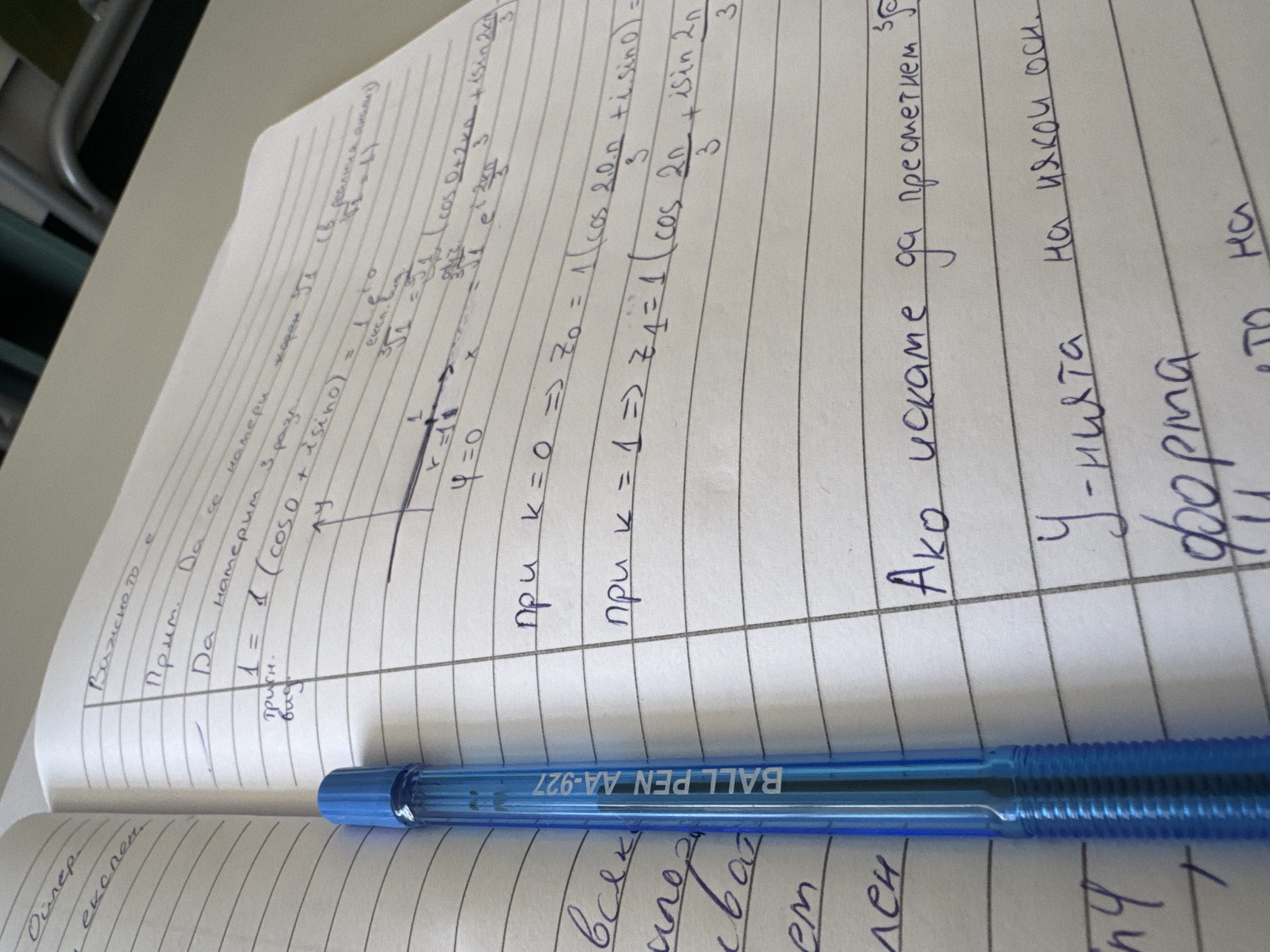 The scene depicts a close-up, high-angle view of an open, lined notebook positioned on a light-colored surface, likely a desk or table, in Plovdiv, Bulgaria. A translucent blue ballpoint pen, marked "BALL PEN AA-927," rests vertically along the left margin of the notebook, partially obscuring the leftmost column of handwritten text. The notebook contains handwritten notes and mathematical equations in dark blue ink, primarily in Bulgarian, involving complex number operations, trigonometric functions (cos, isin), exponents, and variables such as `k`, `z0`, and `z1`. A hand-drawn Cartesian coordinate system with x and y axes is visible, including an arrowed line segment originating from the origin. Key Bulgarian phrases visible include "Важното е" (The important thing is), "Прим." (Example), "Да се намери" (To find), "триг." (trig.), "виж" (see), and "Ако искаме да пресметнем" (If we want to calculate). The background is out of focus, showing indistinct light and dark areas with a greenish-teal horizontal element, suggesting an indoor academic or study environment.