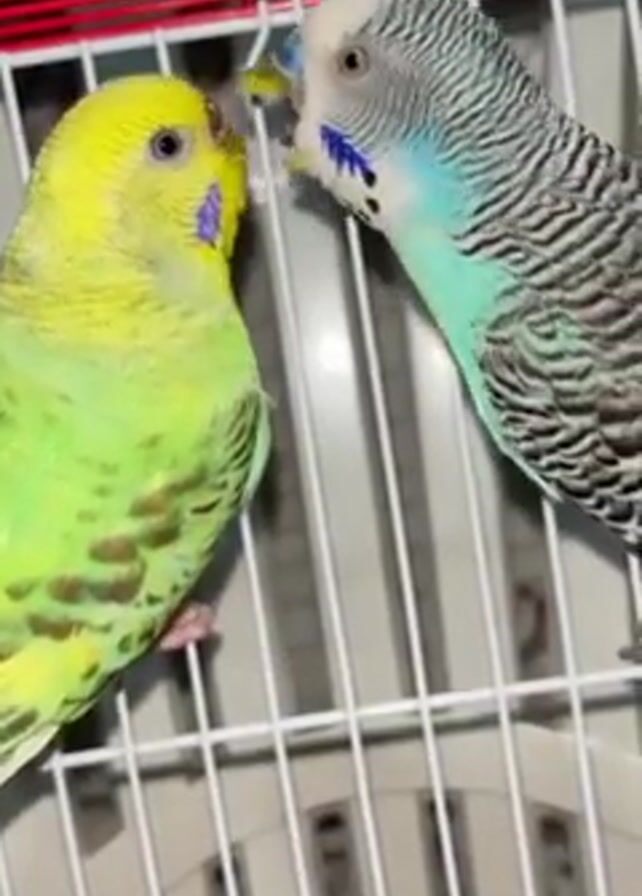 two budgerigars in a cage with a red top. One is predominantly yellow and green, while the other is a mix of white, black, and turquoise. They appear to be interacting, possibly preening each other. The yellow-green budgerigar eventually turns its back to the other, seemingly uninterested. The cage is white with vertical bars. The lighting is artificial.