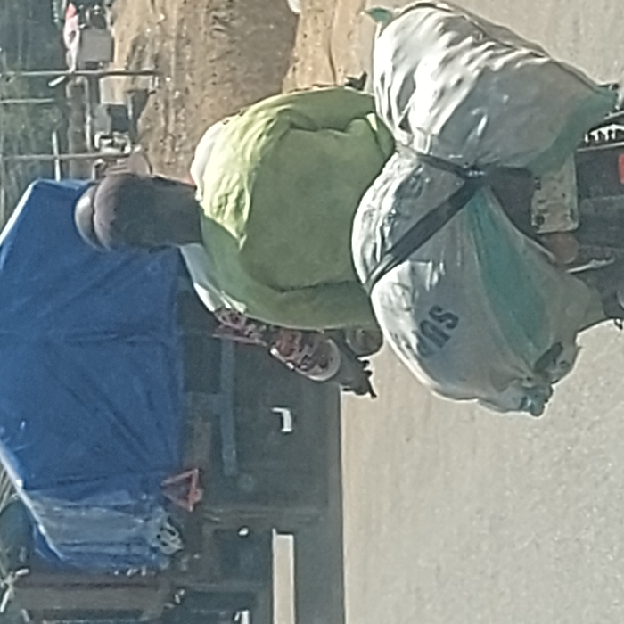 The image depicts two individuals riding a black motorcycle, viewed from the rear, on a paved road in Vom, Nigeria. The front rider wears a light green long-sleeved garment. The passenger, partially visible behind the driver, wears a lighter-colored top. Two large, light-colored sacks, one displaying the partial word "SUP," are securely strapped to the motorcycle's rear. In the left background, a large, dark-colored truck, covered by a blue tarp and displaying a red triangular hazard marker, is also on the road. The broader environment includes dry, dusty terrain with scattered small structures and distant hills under bright daylight conditions.