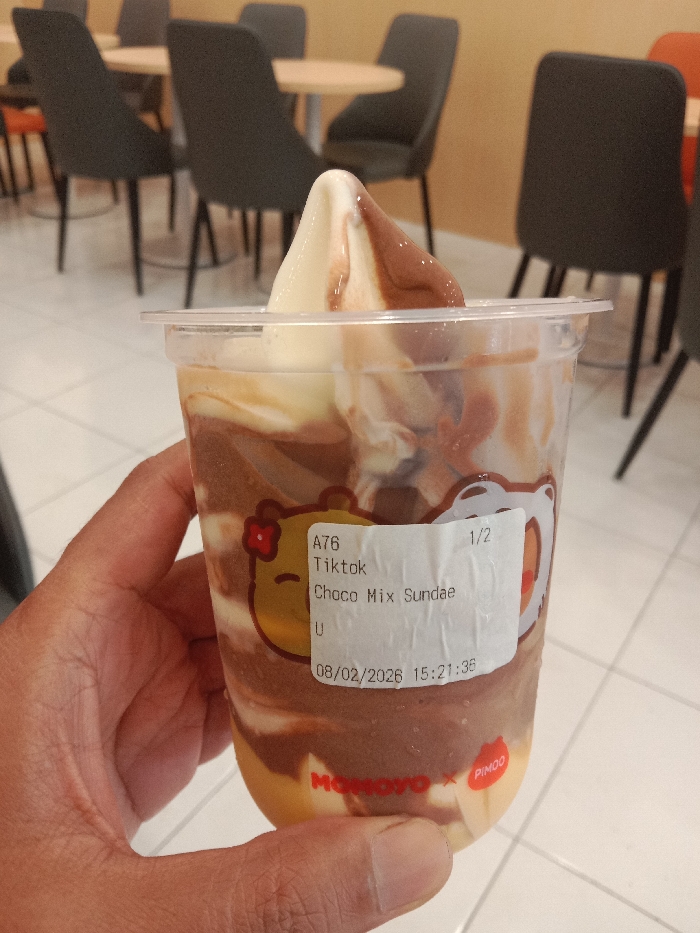 An indoor scene in Kaliwungu, Indonesia, depicts a close-up of a person's hand holding a clear plastic cup. The cup contains a "Choco Mix Sundae," consisting of layered light-colored and dark brown ice cream or soft-serve, topped with a swirl of vanilla and chocolate soft-serve. A white label affixed to the cup displays "A76," "Tiktok," "Choco Mix Sundae," "U," "1/2," and the date and time "08/02/2026 15:21:36." Red branding text "MOMOYO x PIMOO" and partially obscured cartoon bear graphics are visible on the cup. The background features a light tan wall, white tiled floor, and dark grey upholstered chairs with black legs, some with light-colored round tables, suggesting a commercial dining area. One chair in the background has an orange backrest.