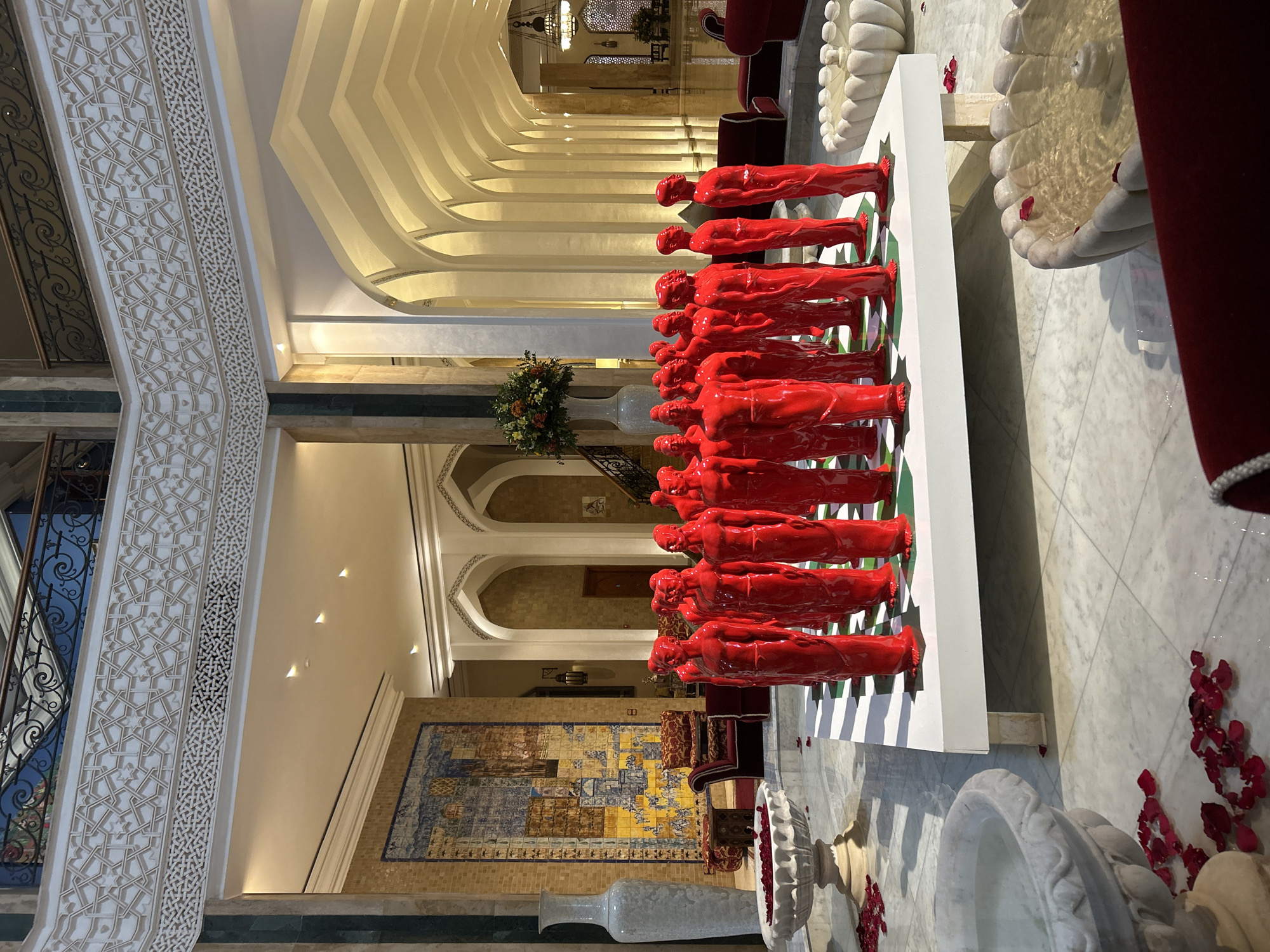 The image captures an interior view within what appears to be a hotel or palace in Marrakesh, Morocco. A series of arches defines the hallway, while a large tiled mural adorns a wall on the left. The focal point is a sculpture featuring a line of red human figures displayed on a checkered platform. Additional architectural details include a water fountain and decorative patterns on the walls and ceilings. Rose petals are scattered on the floor.