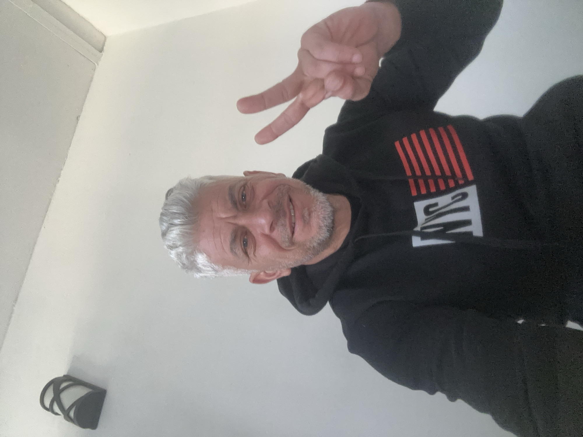 A man with gray hair and a beard is holding up two fingers in a peace sign. He is wearing a black hooded sweatshirt with a red and white logo on the chest. The background is a white wall and ceiling. An object that may be a shoe hangs from the wall at the bottom left. The location appears to be indoors and is not identified as Kiten, Bulgaria.