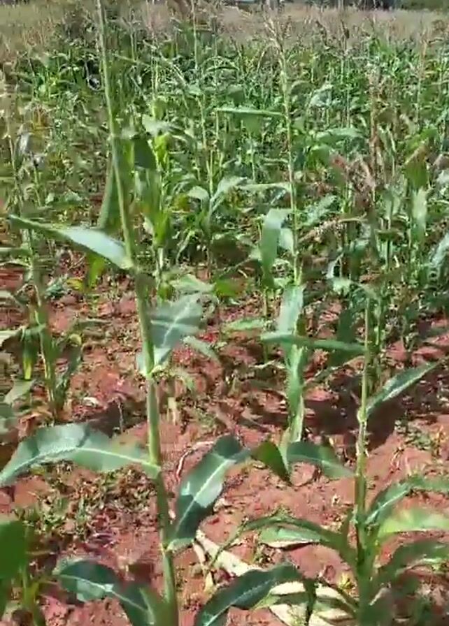 field of corn plants. The plants are green and growing in red soil. There are other plants growing near the base of the corn stalks. Trees are visible in the background under a blue sky. The camera moves slightly through the field, showing the density of the corn plants.