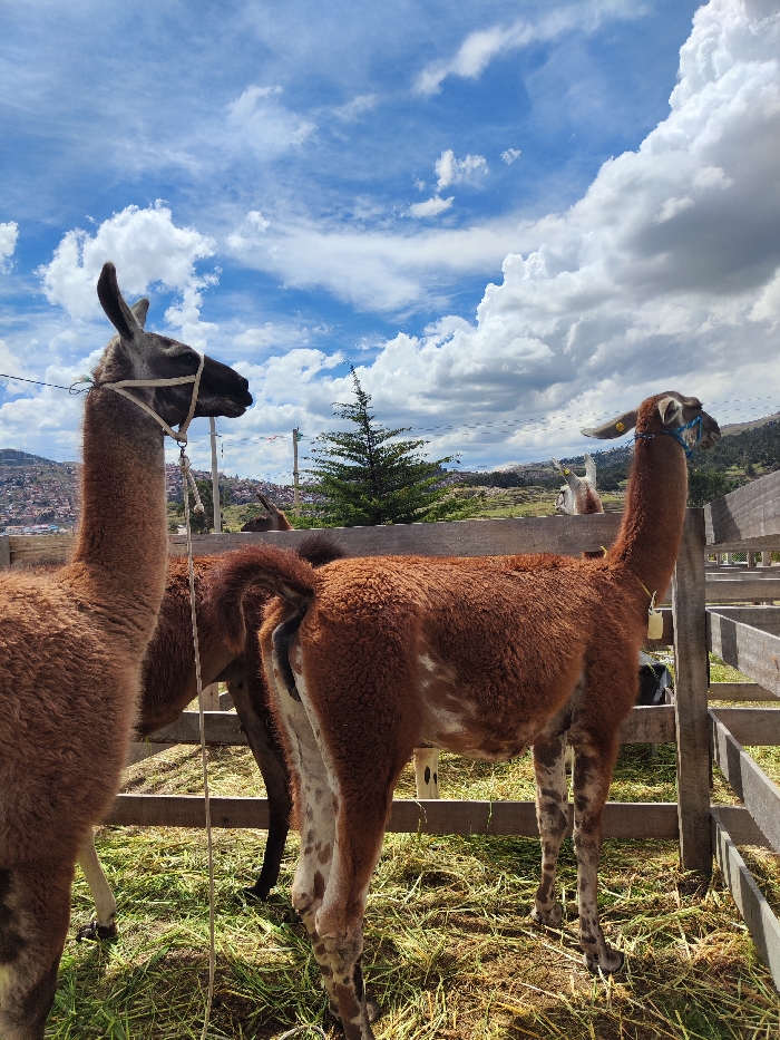 - "Several llamas stand in a fenced grassy area under a partly cloudy sky" by FM-20kwN2, licensed under CC BY 4.0
