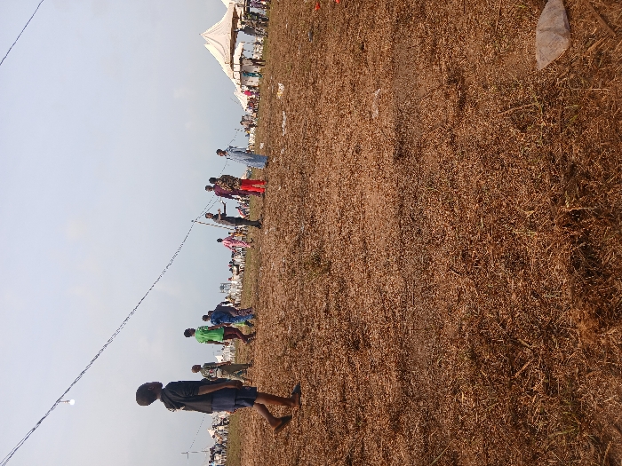 A wide shot shows a dry, grassy field under a pale sky. A white tent stands in the background, surrounded by indistinct figures. A wire stretches across the scene. In the foreground, several people walk along a path. They are seen at various distances, with a boy closest to the viewer wearing a dark shirt and blue shorts. The field appears to be an open space possibly being used for an event.