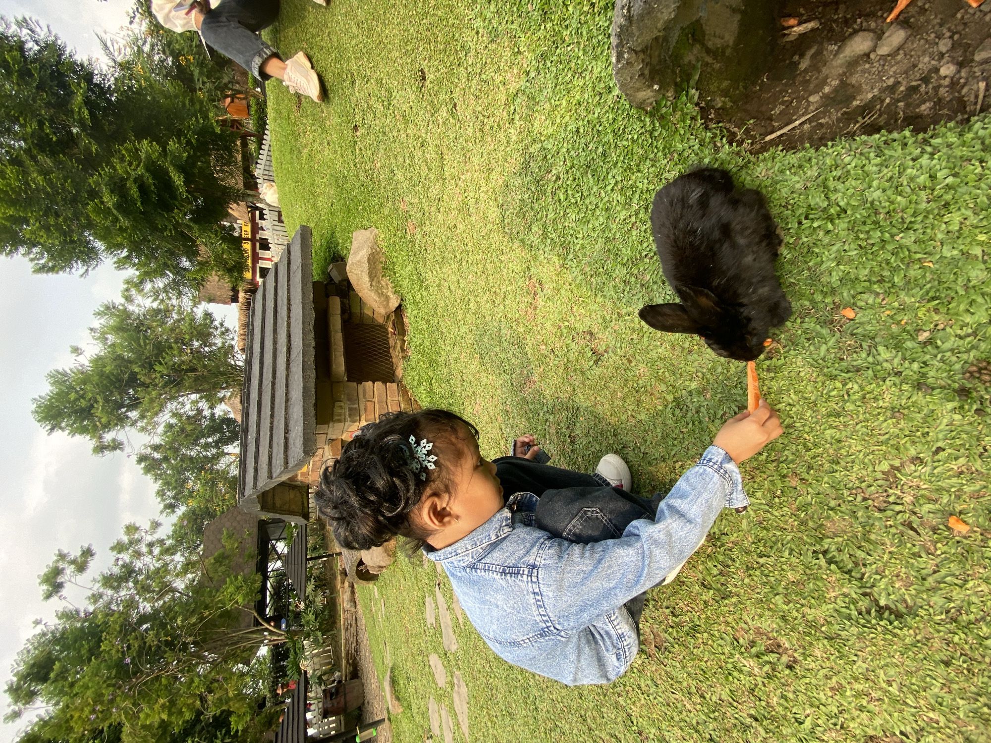 A child with a denim jacket and a snowflake hair clip feeds a carrot to a black rabbit in a grassy area. In the background, there's a wooden structure and other people. The scene takes place in Prigen, Indonesia.