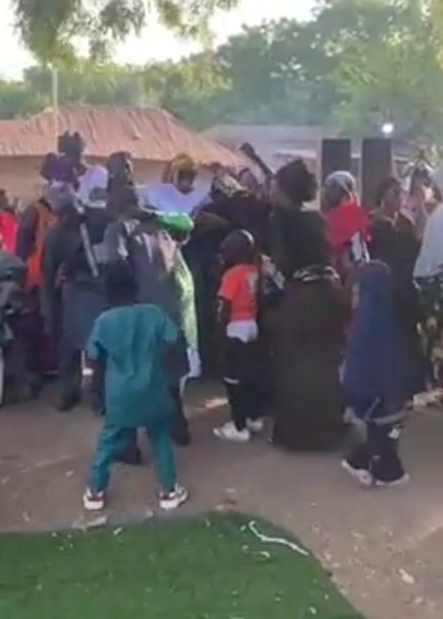 gathering of people dancing outdoors. The individuals are diverse in age, and their clothing suggests a cultural or traditional event. Some are dressed in dark-colored attire, while others wear lighter colors, including a white garment worn by someone in the center. Several children are present, with one in an orange shirt and another in a green outfit actively dancing. The setting appears to be a village or rural area, with simple buildings in the background and trees overhead. Speakers are visible, implying music is being played. A patch of artificial turf lies on the ground in the foreground. The general atmosphere is lively and celebratory.