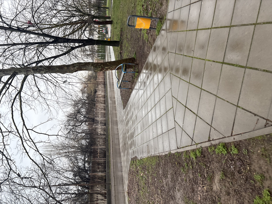 An outdoor urban scene in Targovishte, Bulgaria, is depicted under an overcast sky with wet surfaces. A light grey paved pathway, composed of square and diamond-patterned blocks, extends from the foreground to the midground, reflecting the sky. To the immediate left of the path, exposed soil with sparse green vegetation is present. To the right of the path, a bare deciduous tree with a thick trunk stands, partially obscuring a metal bench with a blue frame. Further right, a yellow cylindrical trash receptacle on a dark metal stand is visible. Beyond the pathway and grassy verge, a wet asphalt road runs parallel to the path, with a single dark-colored vehicle receding in the distance. A long, weathered fence lines the opposite side of the road, backed by a dense formation of bare trees and shrubs extending to the horizon. No individuals are present.