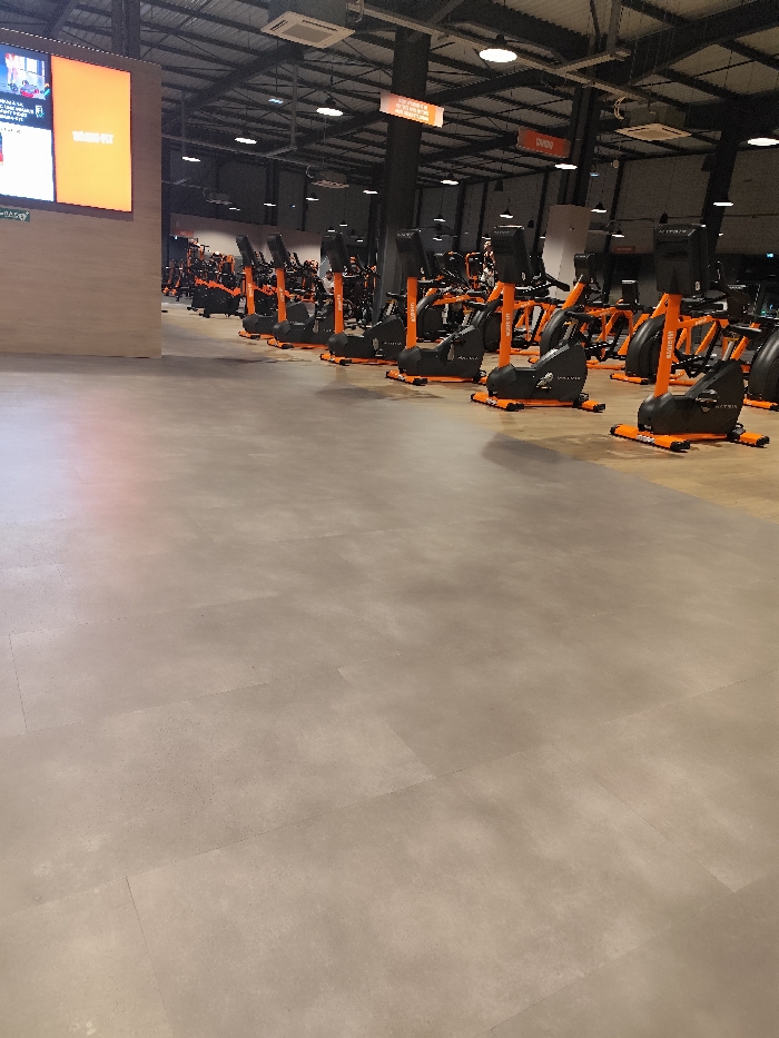 The image showcases an indoor gym with rows of stationary bikes, arranged in neat lines. These bikes are predominantly black with orange accents. The floor is covered in light-grey tiles. In the background, gym signage is visible. The gym has a high ceiling with exposed metal beams and multiple light fixtures. The overall scene conveys a sense of order and cleanliness within a modern fitness environment.