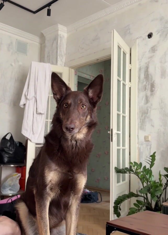 medium-sized dog indoors in what appears to be a living room or bedroom. The dog has brown fur with tan markings, pointed ears, and is initially sitting on a bed or couch. The dog looks toward the camera, then stands up. It briefly disappears from the frame as the camera angle shifts upward. The dog then reappears on the bed with a green ball in its mouth. The background of the scene includes a bed or couch with a grey patterned cover, a white door or doorway, and a light-colored wall with what seems to be a textured or patterned finish. A plant and a side table can also be seen in the background. There is a person seated on the bed, whose legs and hand are visible in the bottom left corner of the frame.