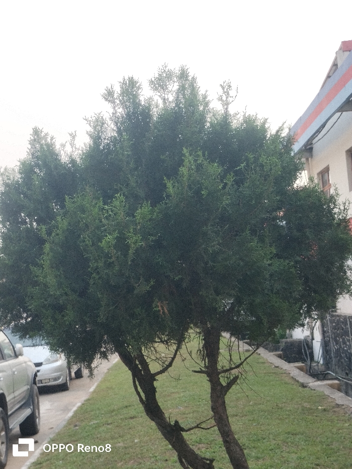 This is an outdoor, static scene captured in Lagos, Nigeria, under an overcast sky. The image is dominated by a large, dense evergreen tree with dark green foliage, featuring at least two distinct trunks originating near the ground and branching extensively. To the left of the tree, a paved surface borders a strip of green grass. Parked on the paved surface, in the mid-ground, are two vehicles: a light-colored SUV or truck, with its front left side visible in the lower-left quadrant, and a silver sedan partially obscured behind it. To the right of the grass strip and behind the tree, a light-colored multi-story building is partially visible. This building features a roofline with a light blue fascia and a red horizontal stripe beneath it, along with two rectangular windows with dark frames. A dark, possibly stone-clad, wall section is visible at the base of the building, and utility pipes are present on its exterior near the ground level. A low concrete or stone border runs along the edge of the grass strip on the right. No individuals are present, and no actions or interactions are depicted. The lower-left corner contains an "OPPO Reno8" watermark.