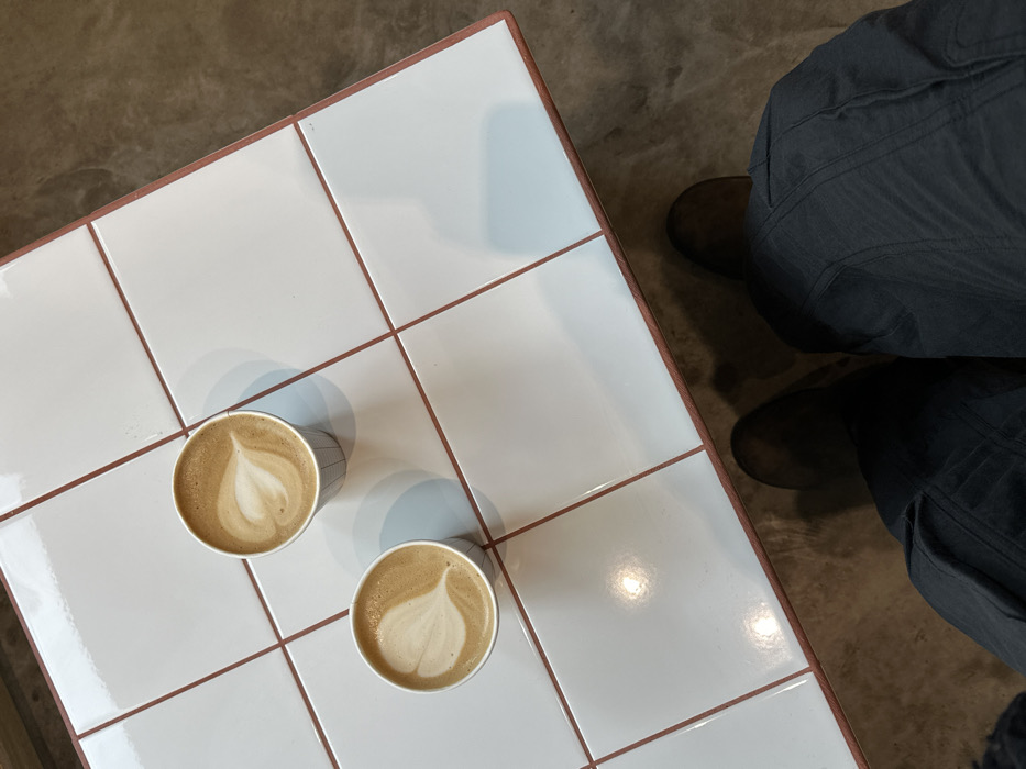 Two latte art coffees sit on a white tile table with reddish grout