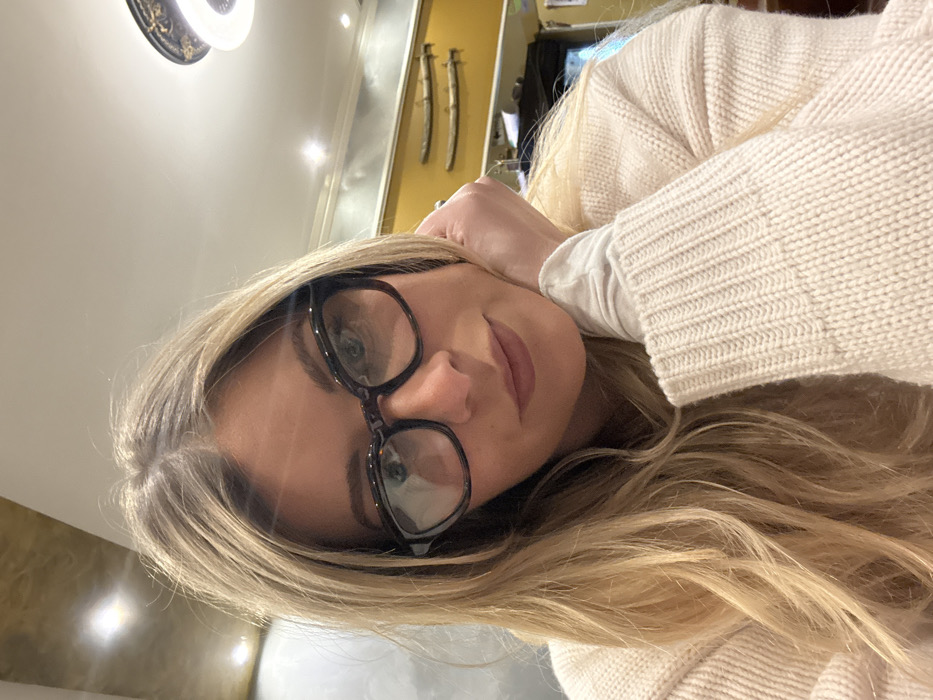 A female individual with long blonde hair, parted in the center, is depicted in a medium-close indoor shot