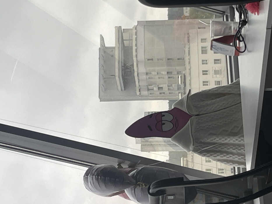 The image depicts an indoor office setting viewed through a large, slanted window on an overcast day in Minsk, Belarus. A two-dimensional cutout of the cartoon character Patrick Star, approximately waist-height, is prominently positioned behind a desk in the foreground, wearing a cream-colored, cable-knit zippered sweater with a high collar. Its facial expression features half-closed eyes, suggesting a sleepy or indifferent demeanor. On the light-colored desk, a red triangular stand, a clear plastic cup with a straw, a coiled black cable, and a partially visible pink fuzzy object are present. To the left, a portion of a black office chair and two partially inflated balloons (one grey, one red/pink) are visible near the window frame. Through the window, an urban landscape unfolds under a uniformly grey sky. The most identifiable structure in the mid-distance is the Press House (Dom Pechati) located at Independence Avenue 79 in Minsk. This multi-story building features a distinct concrete facade and a complex, multi-tiered roof structure. Additional, less distinct buildings and distant foliage are visible in the background. A faint aircraft contrail is discernible in the upper-right portion of the sky. No human figures or active interactions are depicted.