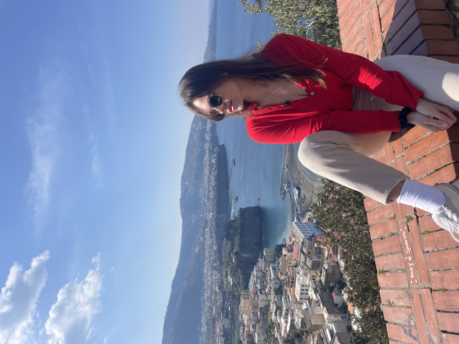 A young woman is seated on a reddish-brown brick wall, offering an elevated panoramic view of a coastal town and the Tyrrhenian Sea in Meta, Italy