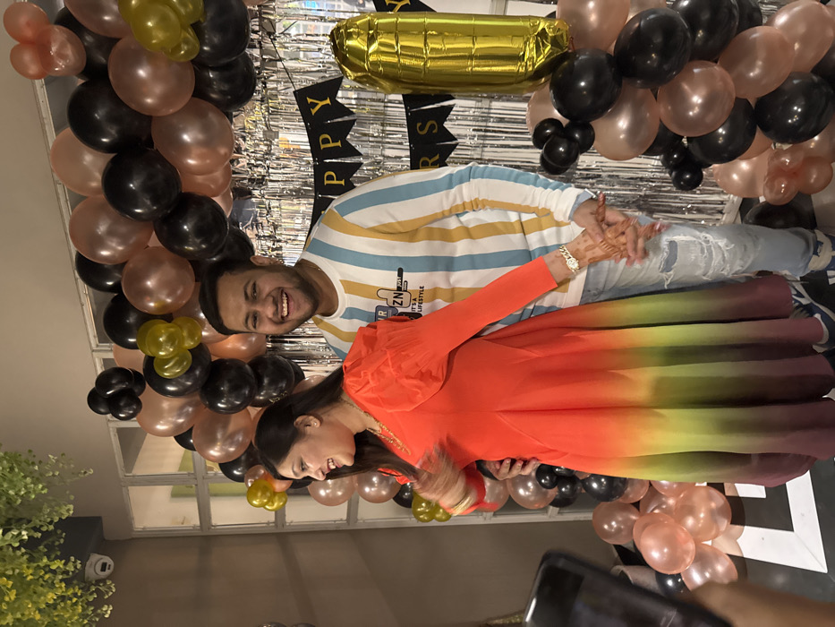 A man and woman pose smiling in front of a balloon arch of copper, black, and gold balloons. A gold, rectangular balloon and a silver tinsel backdrop are visible. The man wears a striped shirt and ripped jeans. The woman wears a long dress with orange, yellow, green, and purple hues. Their hands are interlocked, displaying a watch on the man's wrist and henna designs on their hands.