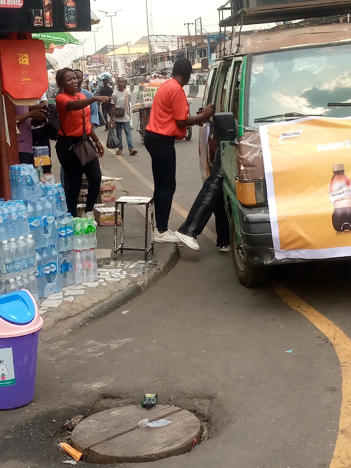 The image depicts a bustling street scene in Aba, Nigeria, during daylight hours, characterized by commercial activity. In the foreground left, a woman wearing an orange short-sleeved top, black trousers, and white sneakers, with a dark shoulder bag, is observed pointing her right arm horizontally towards the background, looking in that direction. Adjacent to her, on the pavement, multiple stacks of bottled water, including "Eva" and "Hydro" brands, are arranged for sale. A small, dark-colored metal stool stands on the pavement. A red commercial sign displaying bottles is mounted on a column to the far left. To the right, a weathered green and brown commercial van or minibus is parked alongside the curb. A large yellow banner advertising "Maltina" with a depiction of its bottle is affixed to the front and side of the vehicle, partially obscuring its front. Another individual, also dressed in an orange top and dark trousers/jeans with white sneakers, is positioned facing the open passenger-side front door of the van, appearing to interact with it. The legs of a third person, in dark attire, are visible entering or exiting the van. The asphalt road features a faded yellow curved line. A circular wooden manhole cover is embedded in the road surface in the lower-center, with a small piece of clear plastic debris and a dark object resting on it. A purple trash bin with a light blue lid, bearing partially visible text including "NIGERIA" and "AGENCY," is situated in the lower-left. In the mid-ground and background, numerous pedestrians are present, including one carrying a black bag and another pushing a vendor cart. Various commercial buildings and stalls line the street, with overhead power lines and signs completing the urban landscape under an overcast sky.
