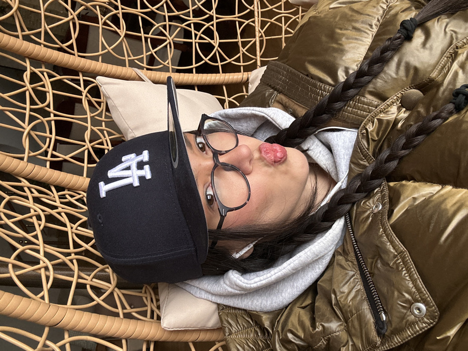 A person lies in a wicker egg chair. They wear a black baseball cap with white lettering, glasses, and a gray hoodie under a shiny gold puffer jacket. The person has long brown hair styled in two braids and is sticking their tongue out. A beige pillow supports the person's head. The background features the woven texture of the chair and a glimpse of an out-of-focus exterior.