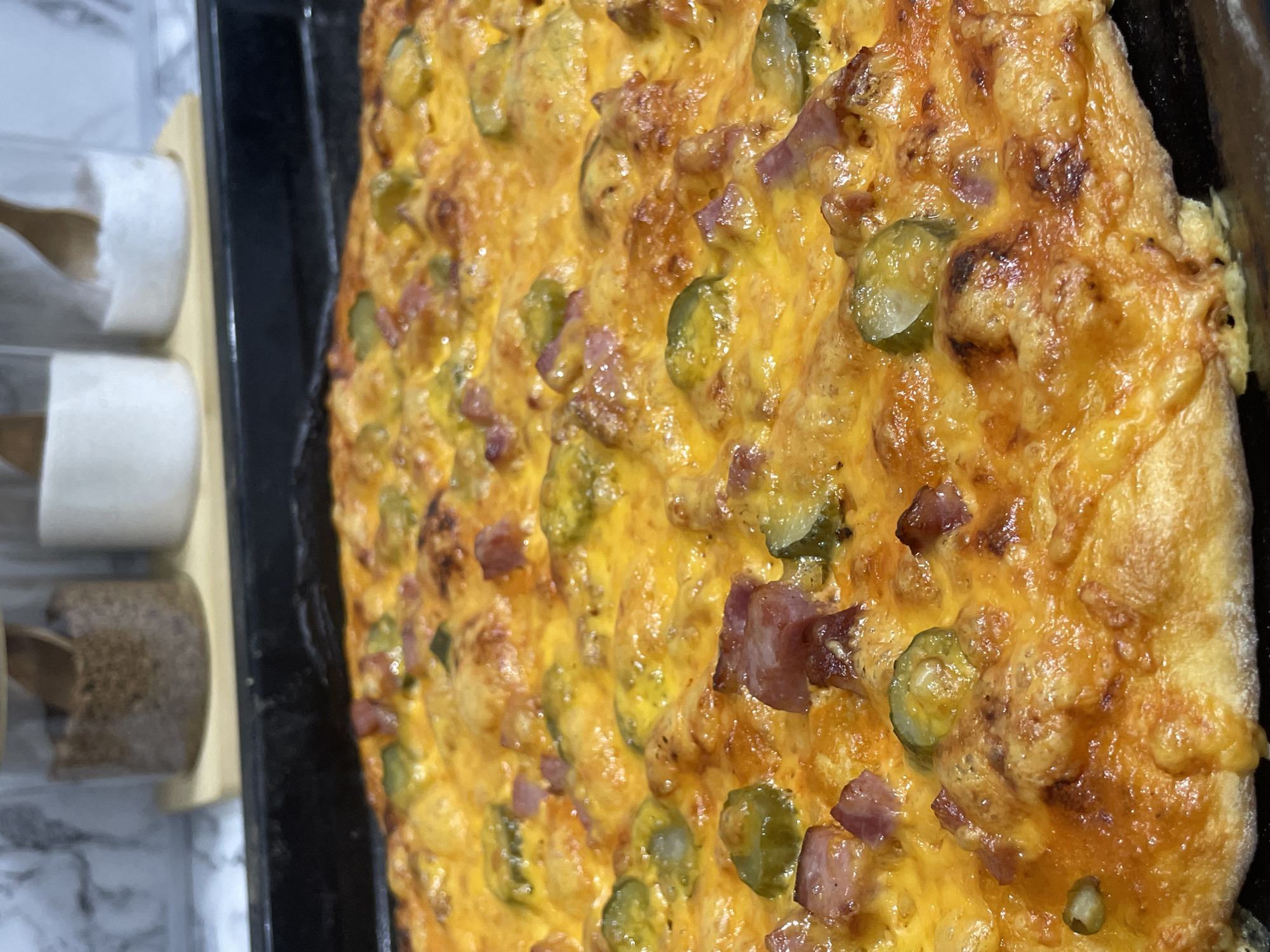A close-up shot of a freshly baked casserole, possibly a breakfast dish, still in its black baking pan. The casserole is primarily yellow and has visible ingredients of cubed ham and green pickle slices on top. A small tray containing containers of spices or seasonings is visible to the left of the casserole. The background appears to be a kitchen countertop with a marble pattern. There is no indication of a specific location in Izhevsk, Russia, or people in the image.