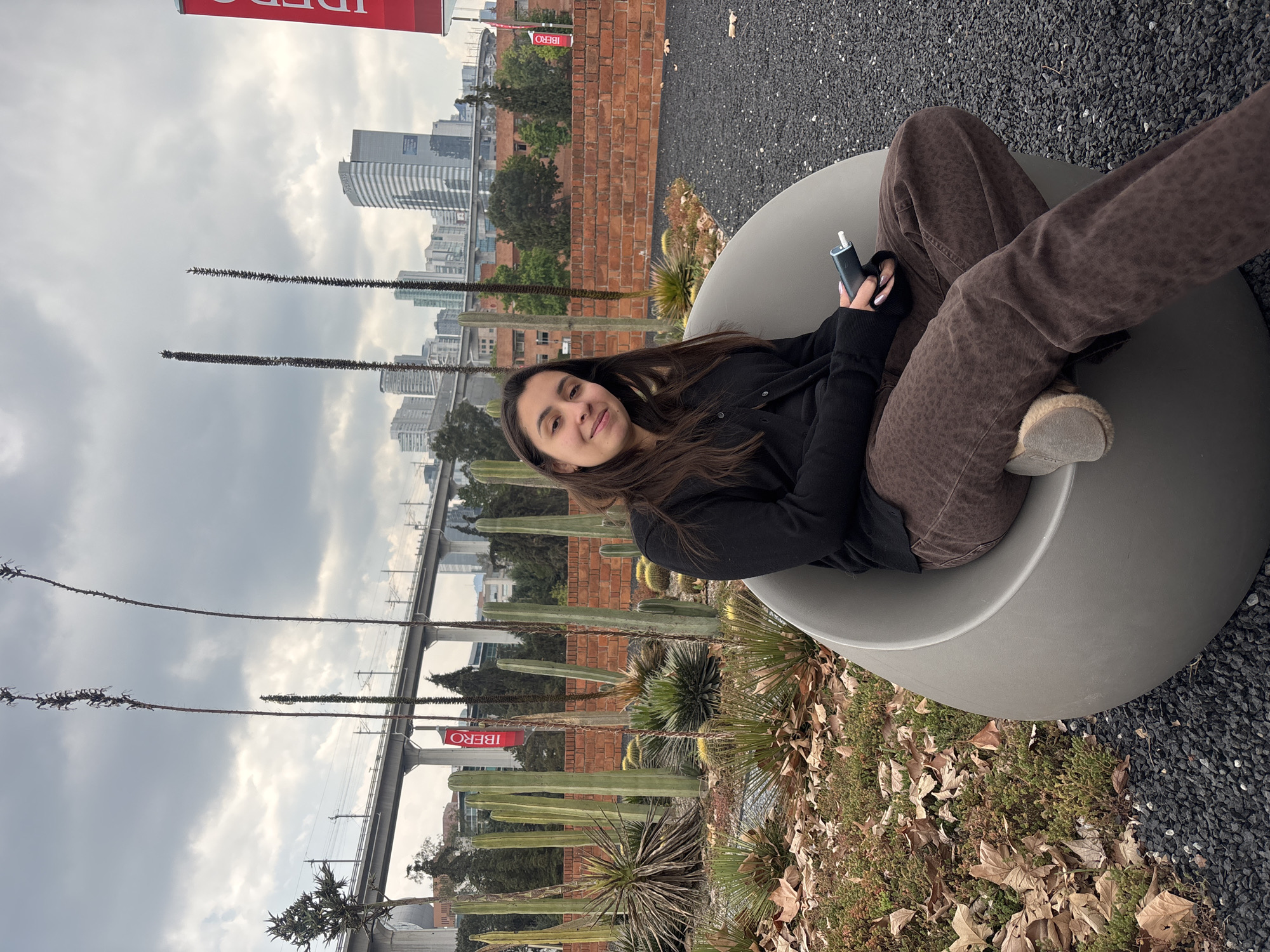 A young adult female is seated outdoors in a modern grey, egg-shaped chair, facing the camera with a slight smile. She has long dark hair and is wearing a black cardigan, dark brown patterned trousers, and light-colored fuzzy slippers. Her legs are crossed, and she holds a dark-colored electronic device in her right hand. The scene is set in a landscaped urban area, identified as being in Mexico City, Mexico, specifically near the Universidad Iberoamericana campus in the Santa Fe district, indicated by red "IBERO" banners. The immediate foreground features dark grey crushed gravel under the chair and extends to a bed of green ground cover interspersed with brown fallen leaves. Behind the subject is a meticulously designed xeriscape garden featuring numerous tall columnar cacti, various other succulents (agaves, globular cacti), and several very tall, dried Agave flower stalks. A reddish-brown brick wall forms a backdrop to the garden. In the mid-ground, an elevated concrete railway bridge, supported by thick pillars, spans the view. Beyond the bridge, a dense cluster of modern high-rise buildings defines the distant city skyline, all under an overcast sky.