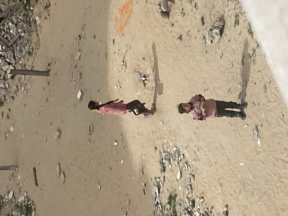 An overhead photograph depicts an open, sandy area in Khan Yunis, Palestinian Territory, strewn with debris under daylight conditions. Two individuals are present. In the mid-ground, a young person with dark braided hair and a yellow hair tie walks from left to right, wearing a pink long-sleeved top, dark striped lower garments, and light-colored footwear. They carry a black bucket in their right hand. Further in the foreground, a younger child stands still, facing slightly right of the viewer. This child wears a pink long-sleeved top, dark pants, and dark shoes, with a small, light-colored object on their head. Their hands are clasped in front of their waist. The sandy ground is marked by scattered fragments of concrete, rocks, and other indistinguishable debris. An irregular orange-red stain is visible on the ground in the mid-right section. In the background, piles of rubble and two dark vertical posts are visible. A white, angled surface partially frames the bottom edge of the image. Both individuals cast shadows diagonally behind them.