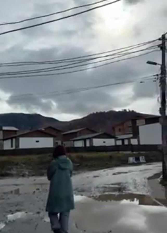 A woman is walking on a muddy road in what appears to be a residential area. The sky is overcast, and the buildings in the background have a modern architectural style. There are puddles on the ground, indicating recent rain or wet conditions. The woman is wearing a long coat and dark pants. Power lines stretch across the sky above the scene. The general atmosphere suggests a cold and damp day.