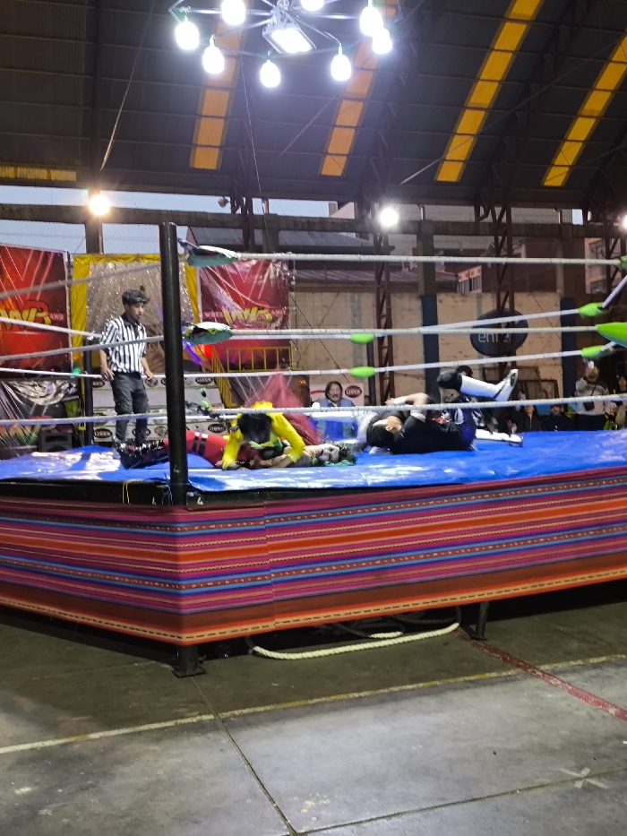 - "A wrestling match unfolds inside a ring adorned with colorful striped fabric" by FM-tC1362, licensed under CC BY 4.0