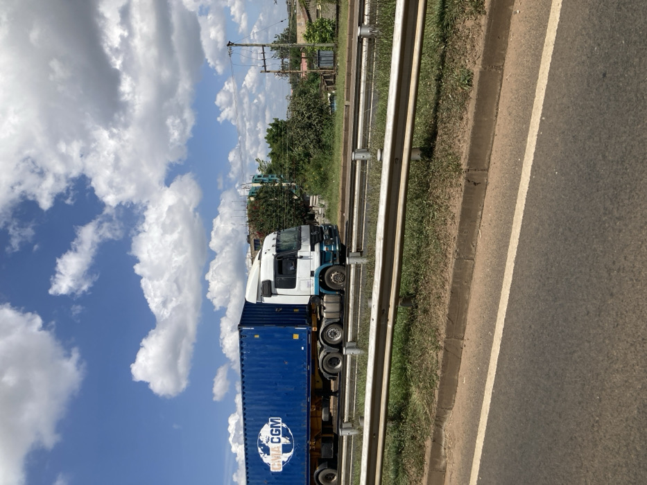 A white Mercedes-Benz Actros semi-truck, featuring a light blue lower cab stripe, travels on a paved road under a bright blue sky dotted with white cumulus clouds. The truck is hauling a blue shipping container displaying the white "CMA CGM" logo. This scene is situated in Kalimoni ward, Kenya. The immediate foreground shows a section of asphalt road with a white lane marker, bordered by a concrete curb and a grassy verge which leads to a metallic guardrail. Beyond the guardrail, the truck occupies an adjacent lane. The background reveals dense green foliage, several structures including one with visible rebar and another with a light blue façade, and multiple wooden utility poles supporting overhead power lines. No individuals are discernible.