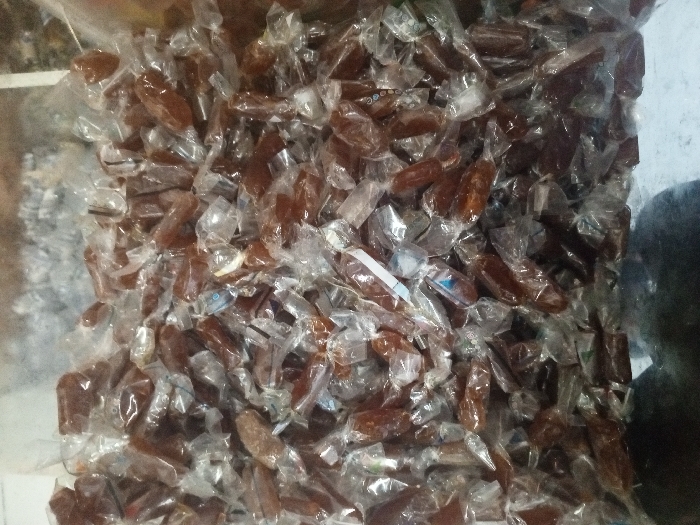 The image displays a large quantity of individually wrapped confectionery items, likely candies, piled together. Each item is dark brown or amber-colored, irregular in shape, and individually sealed in clear, crinkled plastic wrapping. The items are densely packed, filling the majority of the frame. No individuals are present, and no actions or interactions are depicted. The ambient lighting suggests an indoor setting, with faint lighter and darker surfaces visible in the background. The location is in the city of Batheay, Cambodia.