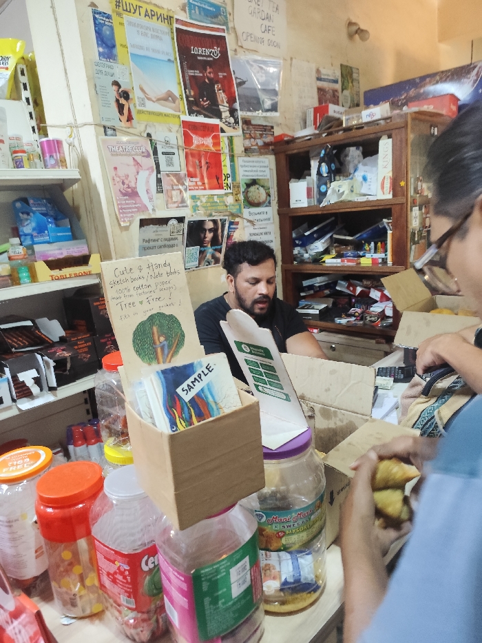 A cluttered storefront features a man behind a counter, possibly the shopkeeper. Colorful posters adorn the wall, promoting various events and services. On the left, shelves display an assortment of products including snacks and toiletries. The counter is laden with plastic jars, a cardboard box filled with sample items, and open cardboard boxes containing goods, including what looks like food in the hand of someone standing in front of the counter. The ambiance suggests a small, local business.