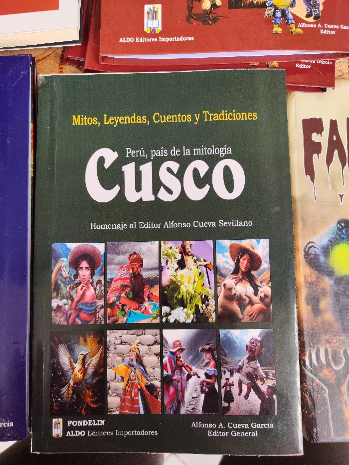 - "A close-up photograph displays a dark green book cover titled "Mitos, Leyendas, Cuentos y Tradiciones: Perú, país de la mitología Cusco," indicating its subject matter is the city of Cuzco, Peru" by FM-20kwN2, licensed under CC BY 4.0