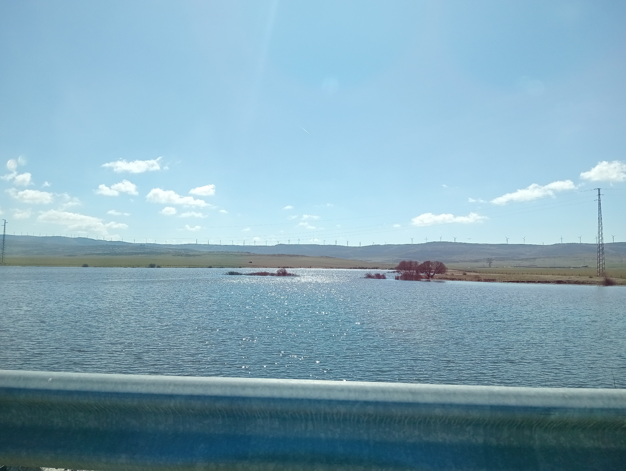 The image displays an expansive outdoor landscape, likely depicting the Embalse de las Cogotas (Cogotas Reservoir) in the province of Ávila, Spain. In the immediate foreground, a metallic, light blue-grey guardrail or bridge barrier runs horizontally across the bottom third of the frame. Beyond this barrier, a large body of water extends, its surface characterized by numerous ripples and sparkling glints from direct sunlight. Several small clusters of bare-branched trees or bushes are visible, emerging from the water at various points. The far bank of the reservoir consists of a strip of land with mixed green vegetation and drier, brownish areas. In the distant background, a range of low, undulating hills stretches across the horizon, densely populated with numerous white wind turbines, indicating a prominent wind farm. Tall, dark metal lattice-work electricity pylons are also visible across this distant landscape, supporting horizontal power lines. The sky above is a clear, light blue with scattered white cumulus clouds, and a faint, thin white aircraft contrail is visible in the upper-center. The scene is brightly illuminated by daylight. No human figures or direct human actions are discernible.