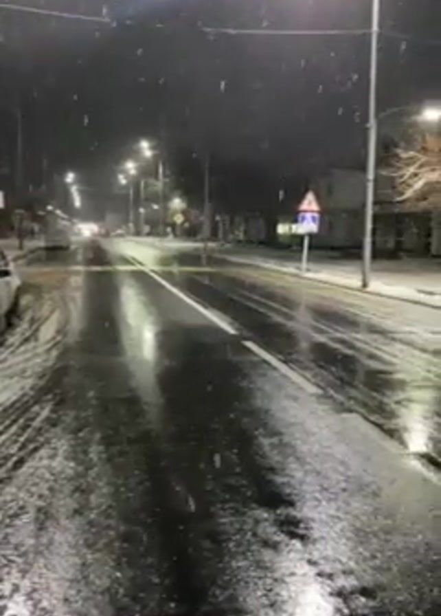 The scene is a nighttime view of a snow-covered street in a residential area