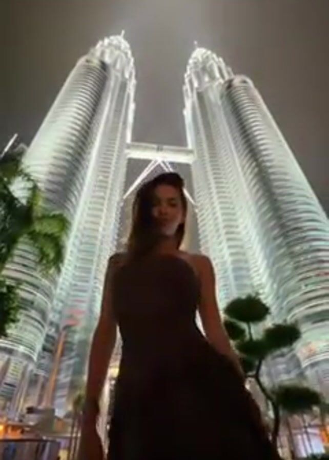 A woman in a black dress is standing and posing in front of the Petronas Twin Towers in Kuala Lumpur, Malaysia, at night. She is facing the camera initially, then turns around to look at the towers, placing her hands behind her head. The towers are lit up and the night sky is cloudy. There are trees and other greenery in the foreground around her.
