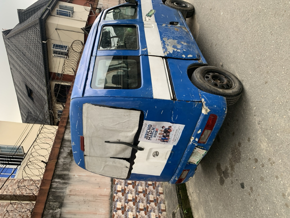 A blue and white minibus is parked on the side of a street. The vehicle has visible wear and tear, with scratches and chipped paint. A poster, featuring people and the words "JERICHO MARCH," is attached to the back of the van. The back window is covered with a white sheet. A building with a dark grey roof is visible in the background, along with a fence topped with barbed wire. The road is gray and shows some signs of wear.