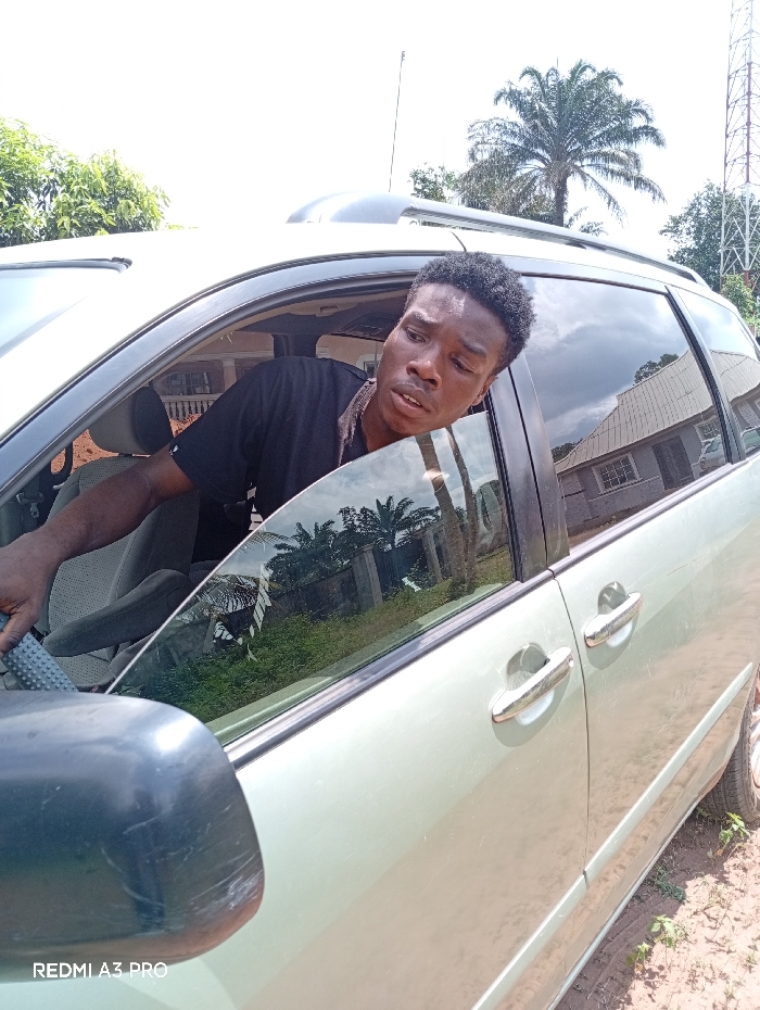 An adult male, with dark, curly hair and wearing a black t-shirt, is positioned in the driver's seat of a light green minivan or SUV, leaning out of the open driver's side window. His right hand rests on the black, textured steering wheel. The vehicle features a black side mirror with visible scuff marks and a roof rack system. The interior seating is light-colored. The scene is an outdoor setting in Osina, Nigeria, under bright sunlight. The background includes a prominent palm tree, other green foliage, a partial view of a building with a light-colored roof and dark windows reflected in the car glass, a concrete fence, and a tall metal lattice communication tower on the far right. The ground adjacent to the vehicle is dry earth with sparse vegetation.