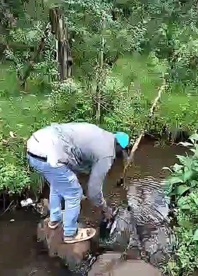 A man standing on rocks in a shallow stream in a wooded area reaches into the water