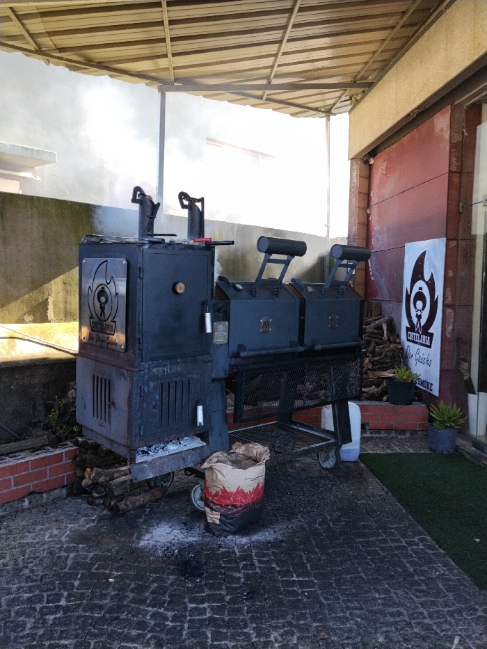 An industrial-style black metal barbecue smoker assembly, consisting of a vertical firebox on the left connected to two horizontal smoking chambers on the right, actively emits dense white smoke from two smokestacks. The smoker is situated on dark, possibly damp, cobblestone paving under a corrugated metal awning, likely an outdoor cooking area for a restaurant in Viana do Castelo, Portugal. Scattered ash is visible on the paving near the smoker's base, where a pile of cut firewood rests on a brick edge. An open brown paper bag with a red flame logo, appearing to contain charcoal, stands upright nearby. To the right, a reddish-brown wall displays a white banner with a logo featuring a stylized figure in a chef's hat within a flame, accompanied by the text "COSTELARIA Our Gaúcho" and "TRUE SMOKE." Two potted plants, possibly succulents, are placed at the base of this wall. The smoker itself features a metal plaque with the "COSTELARIA Our Gaúcho" logo on its left unit. No individuals are present in the scene.