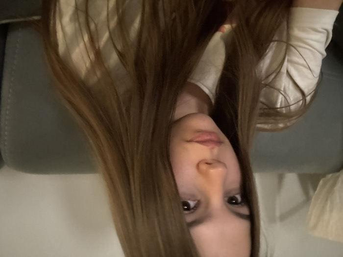 An image depicts a close-up, chest-up view of a young female individual situated indoors. The individual has long, straight, reddish-brown hair that extends past her shoulders and chest. She is looking directly towards the camera with a neutral expression, dark eyes, and closed lips. She wears a light-colored, possibly white or off-white, short-sleeved t-shirt. Behind her, a grey upholstered couch or armchair is visible, featuring distinct stitching on its surface. To the far left, a portion of a lighter-colored, possibly white or cream, cushion or pillow is present. The background appears to be a wall, lighter in tone than the couch. The specific location in the city of Plovdiv, Bulgaria, cannot be determined from the visual information provided in the image.
