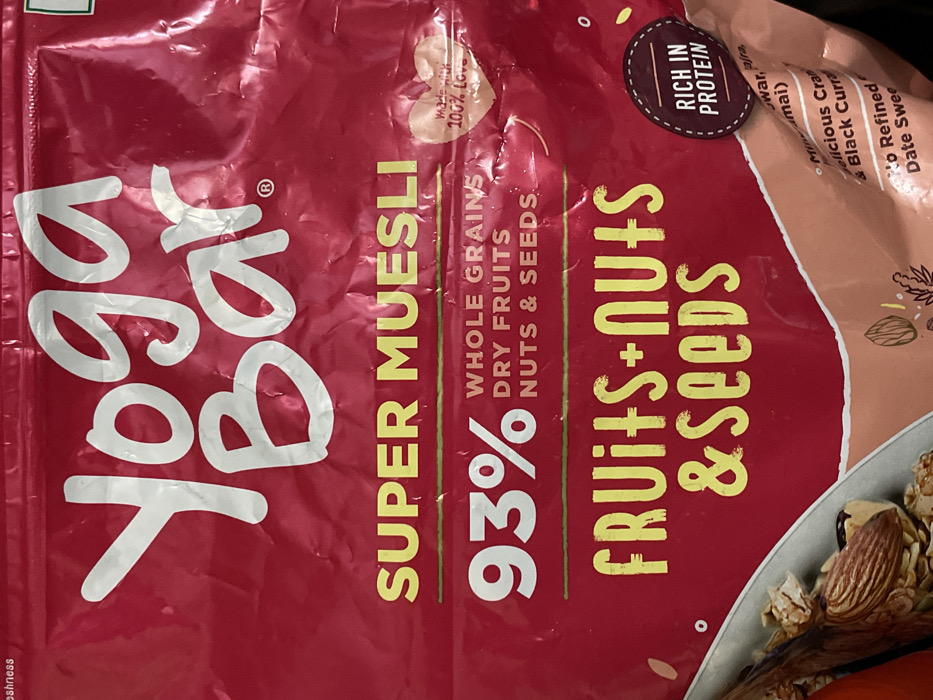 close-up of a red and white bag of "Yoga Bar" super muesli