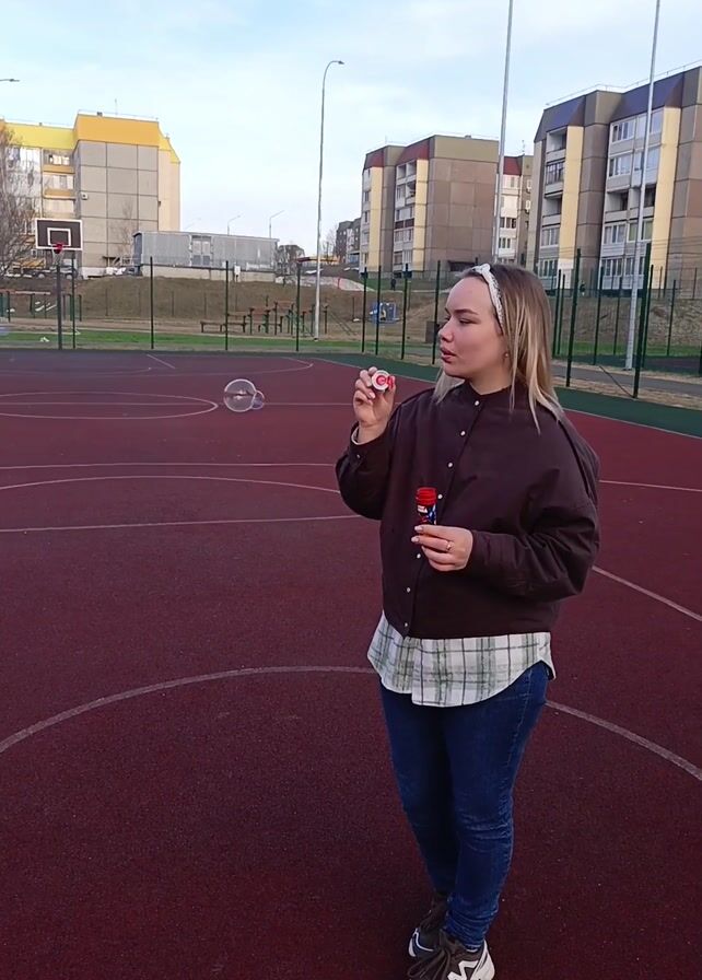 - "A woman blows bubbles on a red-and-green basketball court on an overcast day, surrounded by buildings" by FM-AjKBn1, licensed under CC BY 4.0