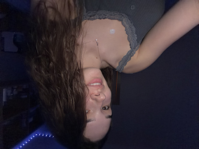 A woman is smiling, looking at the camera. She has long brown hair and is wearing a gray tank top with lace trim. A necklace is visible on her chest. She appears to be in a dimly lit room with some shelves and a glowing blue light in the background.