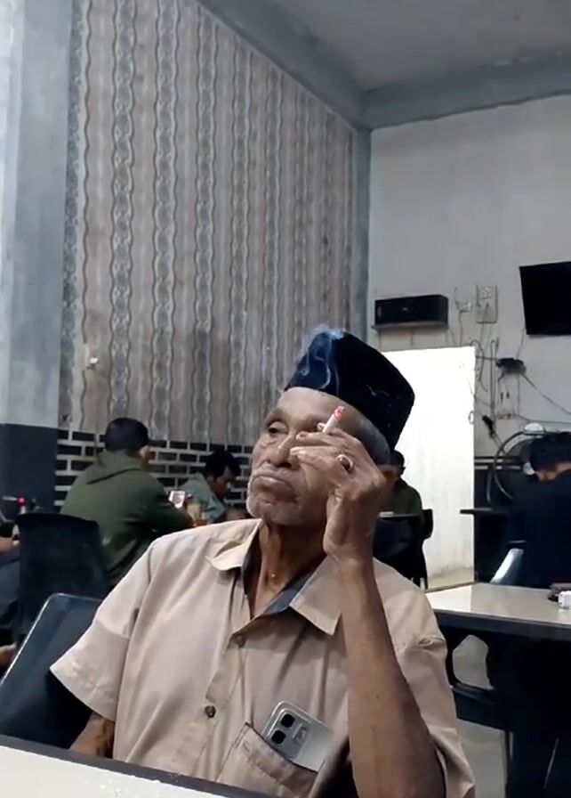 n elderly man sitting at a table in what appears to be a public space, possibly a cafe or restaurant. He is wearing a beige shirt, a black cap, and a ring on his finger. He is holding a lit cigarette and looking up, seemingly lost in thought. In the background, several other people are seated at tables, with some of them appearing to be engaged in conversation or using their phones. The room has striped wallpaper on one wall, and there is a small television and other electrical fixtures on another wall. A bicycle is also visible leaning against the wall in the background. The atmosphere seems casual and relaxed.