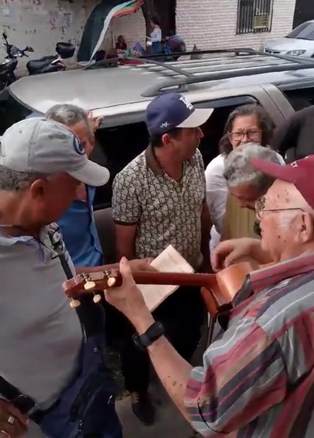 group of older adults gathered outside, seemingly in a parking area or on a street near buildings and parked cars. A man is playing a small guitar and singing for the group. A table is set up where some people are getting food, possibly arepas. The environment appears to be a residential or commercial area with trees and buildings visible in the background.