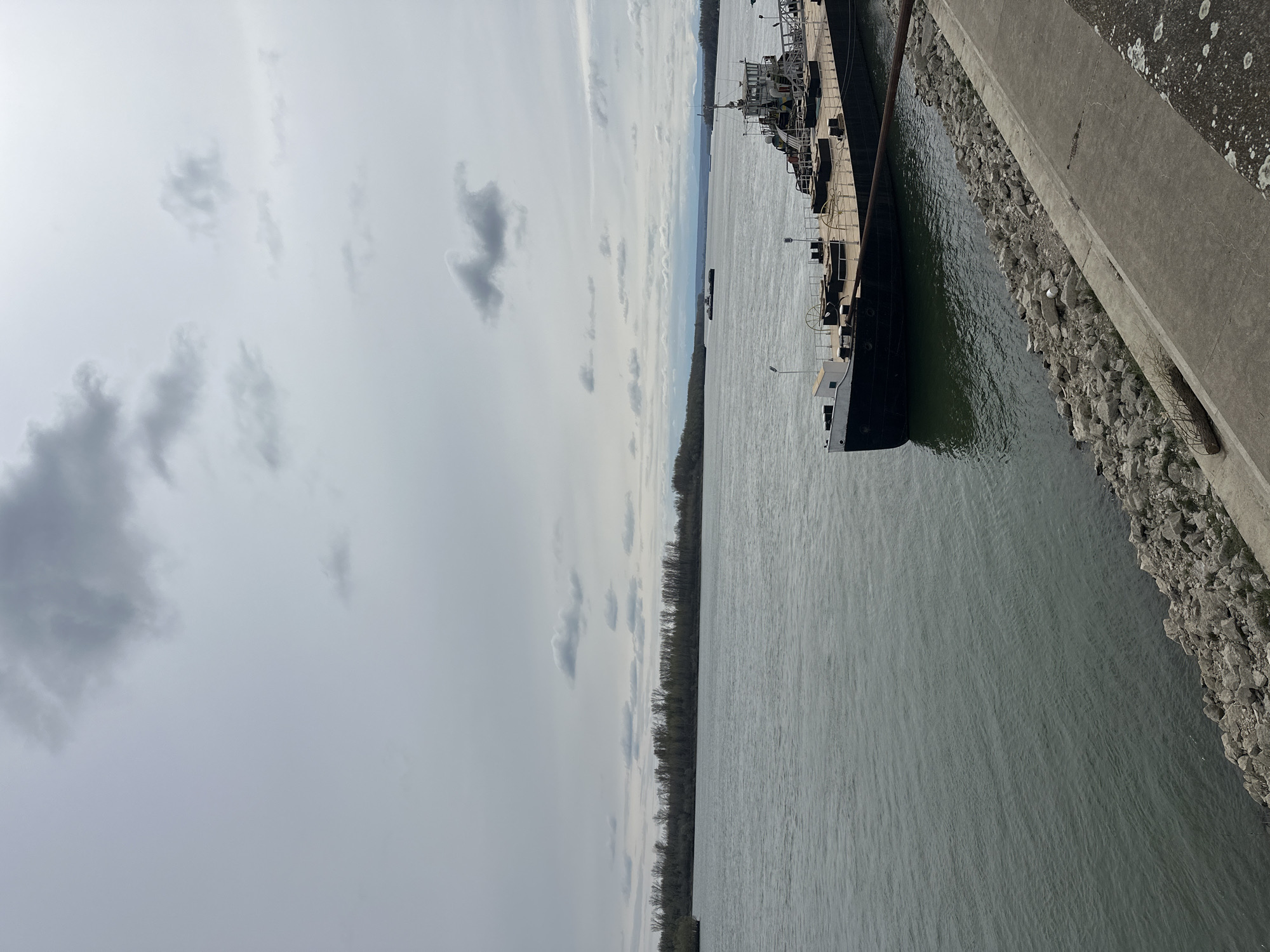 The image depicts a large cargo ship docked along the Danube River in Vidin, Bulgaria. The ship is moored along a concrete embankment reinforced with large rocks. The river surface is visible, showing ripples and a slightly murky color. A line of trees is visible along the opposite bank of the river. The sky is overcast with scattered clouds. The perspective is from an elevated position looking down at the ship and river.